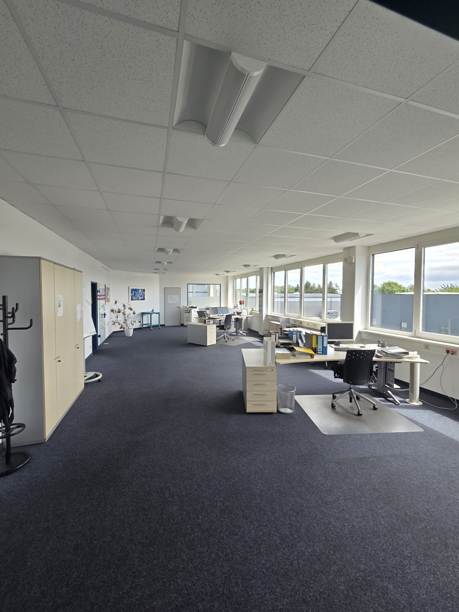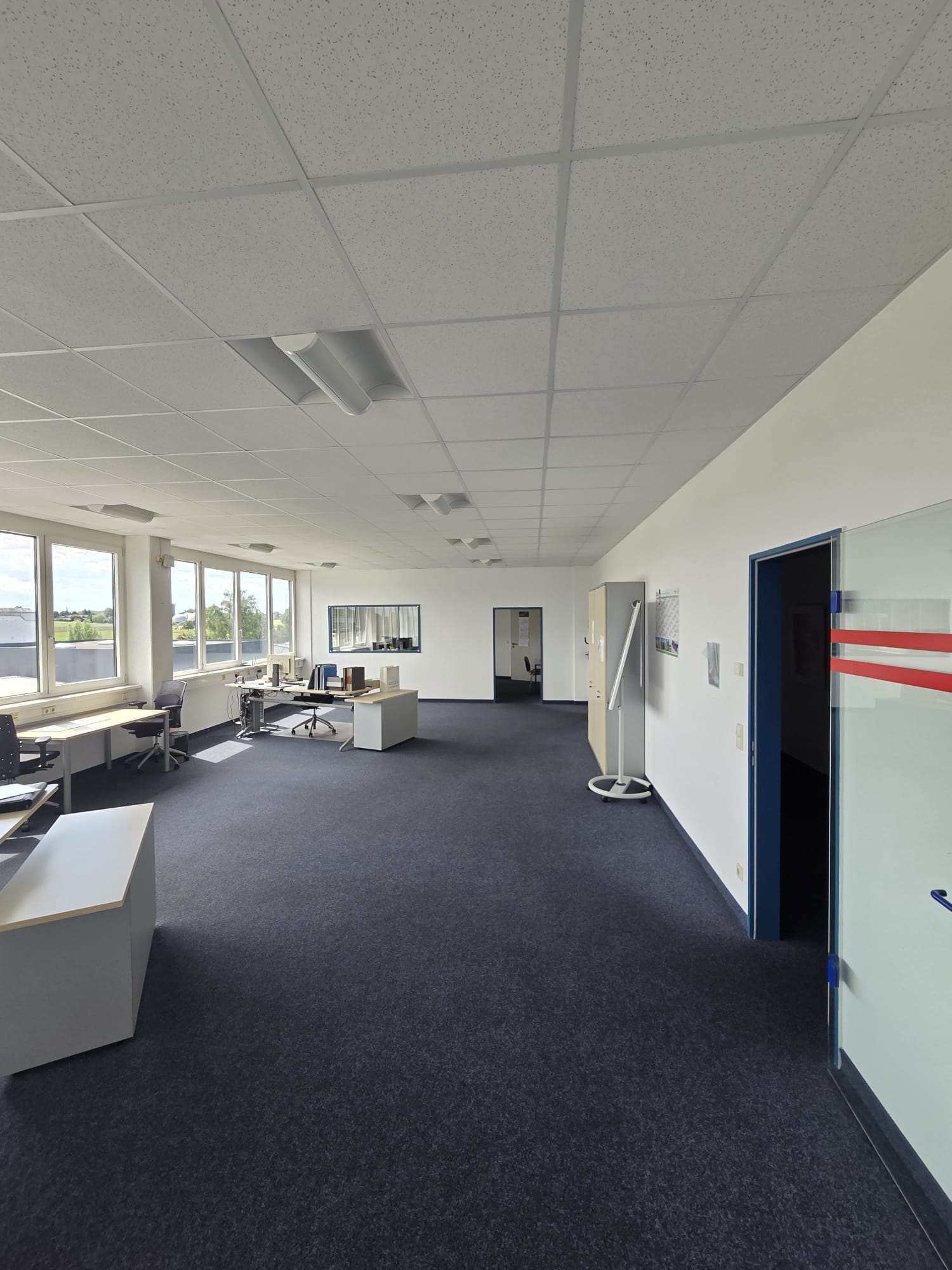 Hier erwartet Sie in der zweiten Etage die sehr geräumige helle Büroetage des modernen und gepflegten Gebäudes. Das Großraumbüro mit 260 Quadratmetern wurde 2024 renoviert. Teeküche und Sanitäranlagen wurden neu eingebaut. Die komplette Büroetage ist mit einem gepflegten dunklen Teppichboden ausgestattet. Die vorhandene Fußbodenheizung sorgt für ein angenehmes Raumklima.